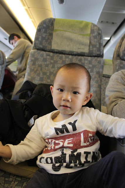 不過後來空姐來問我們的時候說,後面電視壞了,但有三個位子能坐,想問我們可不可以跟那一對情侶換座位,因為沒人想換,我跟皓媽想想後,一來這空姐是剛剛讓我們先退稅的空姐、二來坐位子上皓皓可能也比在提籃裡舒服吧~所以我們的位子就被換到我同事的正後方了,哈~太巧了~~