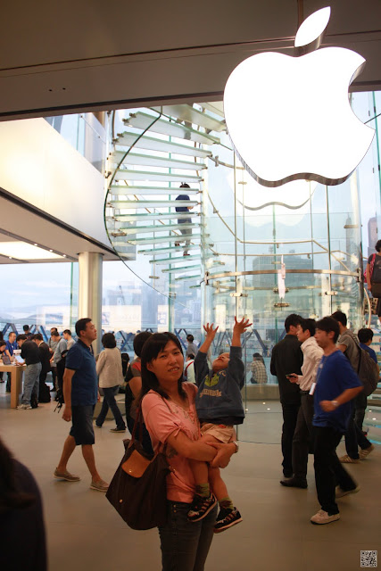 這裡的Apple旗艦店沒有我們想像中的大,倒是那個玻璃做的透明旋轉樓梯蠻特別的,玻璃本業的皓公嬤研究起樓梯(據皓嬤說法,這個梯子價格不斐,幾百萬以上),我們其他人則是先上去二樓看看風景,拍拍照,這裡有整片的落地窗,往外看可以看到海和天星碼頭,皓爸還在這個地方做了一件非常宅的事情,就是和他手機裡預先存下來的賈伯斯照片合照,天啊~~~不知道有沒有被別人發現,真的是太丟臉了(皓爸:其實我拿出來的時候~我的臉部表情不知道該是要裝難過還是開心=_=)。一樓的大門口上面,掛著一顆大蘋果,很多人都會在那裡拍照,我們也在那裡等著拍照,皓皓看到前面的人拍照,會把雙手舉高假裝捧蘋果,輪到我們拍的時候,皓皓居然也學起前面的人,把他的小手舉起來假裝捧蘋果,孩子…你抱的動那顆大蘋果嗎?我看你應該比較想吃吧!!