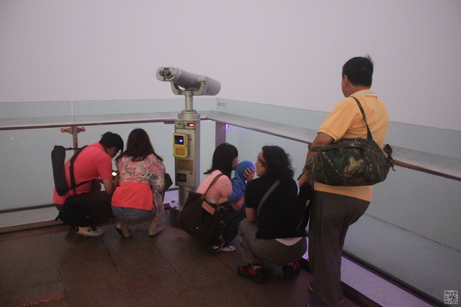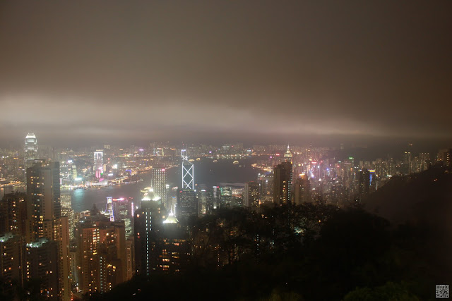 車子差不多只搭了十分鐘左右就到了山頂纜車站,是天氣不好的關係,還是因為今天是平日,買票的人並不多耶,不過因為我們的票是事先在台灣買好的,所以我們不用排隊買票,直接就可以進站了。進站以後等沒有多久纜車就來了。因為我們有事先在網路上查好,人家說要坐靠右邊的位置才有風景可看,所以一上車就馬上衝右邊,但是這時候雨也還是很大,即使坐右邊我們也看不到什麼風景,看出去是一片霧濛濛。一下纜車也是會先經過一大堆的紀念品店,因為天還有一點亮,皓爸想先上去凌霄閣看看傍晚的景色,再等一下下又可以順便看夜景,所以催促著大家趕快上去了。但是人算不如天算,上去凌霄閣以後風大雨大,外面又是一片霧,根本看不到什麼風景,必須要等到風把霧吹散了,才能看到短暫的美麗夜景,所以我們在看不到風景時,就要先蹲著躲風躲雨,等到風把霧吹散,再站起來看風景,這裡真的不愧為世界三大夜景之一,超漂亮的啊~~~香港真的是個美麗的城市,連皓皓也一直說好漂亮喔~~~但是實在是因為太冷了,在凌霄閣我們大概只待了十幾二十分鐘吧,就下去準備吃晚餐。