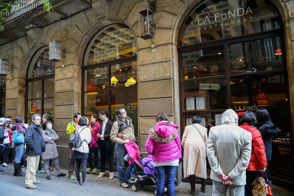 欣賞完奎爾宮後,我們又要去吃東西啦,今天的午餐-La Fonda,這家餐廳是很多人推薦的海鮮燉飯餐廳,因為在網路上查過這家很熱門,有人寫說最好12點半就去排,剛好參觀完奎爾宮走過來的時間也差不多就是12點半,所以我們就排到了第1個啦XD,果然,13:00開門後,立刻就滿座了@_@