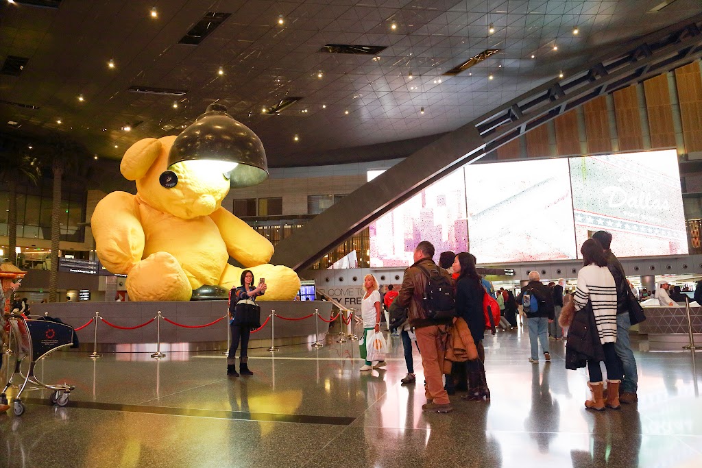 到了杜哈只有一個感覺,就是華麗,機場搞的非常嘻華,有跑車、巨大熊、超可愛的兒童遊戲區、還有室內專車接送服務。另外就是有關在杜哈轉機,之前皓媽在網路上查杜哈機場轉機,是要看在香港機場時給的登機證封套是什麼顏色,就搭接駁車到那個顏色的航廈,但這次實際轉機發現其實不是這樣,就跟一般的轉機一樣,下機之後沒多久會有看板寫航班資訊,過了安檢之後直接走去要搭機的登機門就可以了。