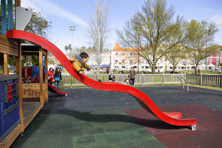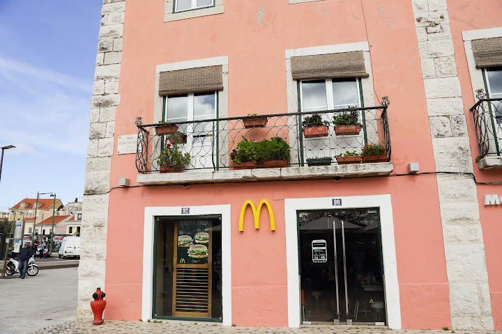 隨著電車穿捘在小巷子中,我們也再次欣賞一下葡萄牙的建築風格,就是外牆都是磁磚去舖設,組出各式各樣的圖,還蠻有特色的,約30分鐘我們就到了「熱羅尼莫斯修道院(Mosteiro dos Jerónimos)」旁的電車站,但因為大家都肚子餓了,所以我們下車後,先去附近的麥當勞解決我們的午餐囉,過去要麥當勞的時候,被皓皓發現附近有個遊戲區,所以這屁孩又開始吵著要玩了,所以就趁著皓媽去點餐的時候,我就先跟他約定好只能玩十分鐘就要回來吃午餐,所以十分鐘後我們就回來麥當勞的戶外用餐區囉,回來的時候剛好餐點也好了,我們就在這美麗的麥當勞,享用我們這次總行程車,最常吃的餐廳XD。